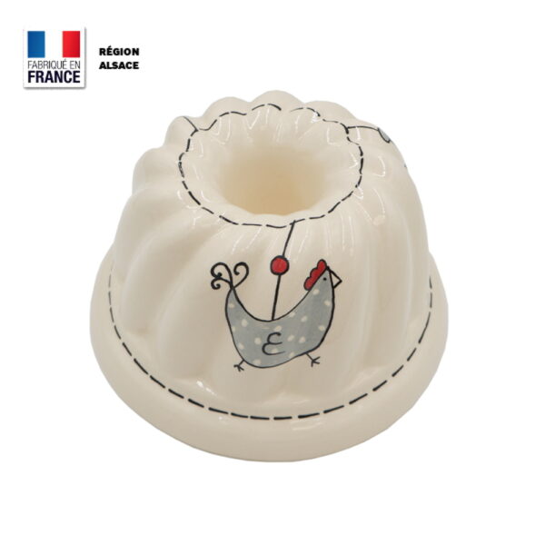 Fabriqué en argile alimentaire blanche de première qualité à Soufflenheim, un village renommé pour sa poterie, ce moule à kouglof décor cocotte est décoré à la main, faisant de chaque pièce une œuvre unique.